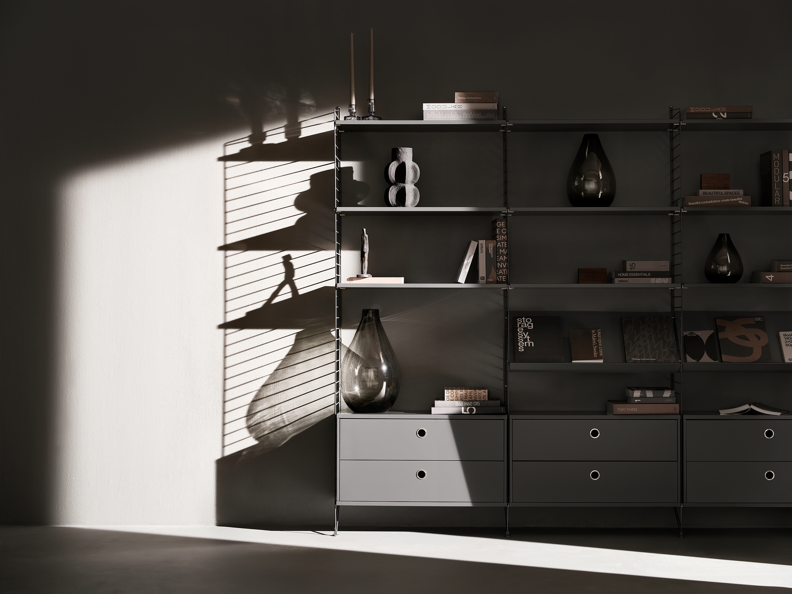 And we don’t mean the shelf they sit on. Though the versatility of String® is seemingly endless, this design classic has only been realised in select colours and materials since its conception. New editions aren’t introduced lightly, but 2025 marks one of these rare moments – meet dark grey. This colour update has been painstakingly considered, from how it harmonises with the existing palette to finding a tone that strikes balance with each wood finish. The result is an engrossing dark grey that pairs effortlessly across the String® System.