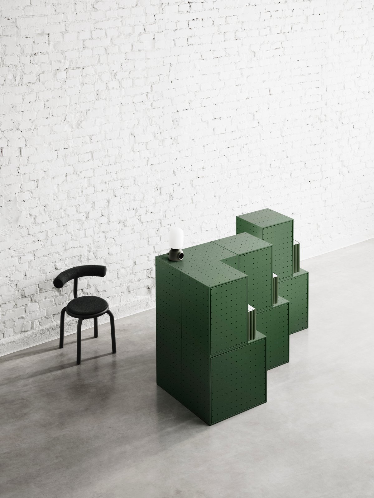 Initially borne of FUWL’s own need for a more flexible workspace, Center Center meets the design duo’s own rigorous criteria. “We were moving into a new office in the post-pandemic period,” says John, “and looking for a system that combined open and closed storage and that could also work as room dividers.” In the absence of any commercially available solution, they set about creating their own. The result is a set of modular, powder-coated metal cubes that can be assembled and reassembled in a variety of different ways.